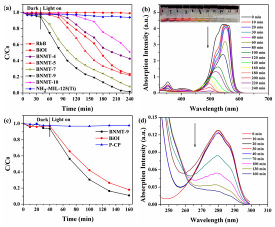 Photocatalytic degradation efficiencies of (a) RhB with initial concentration of 40 mg/L and (c) P-CP with an initial concentration of 10 mg/L over different catalysts under visible-light irradiation, and time-dependent UV–vis absorption total spectra of BNMT-9 degradation (b) RhB and (d) P-CP.