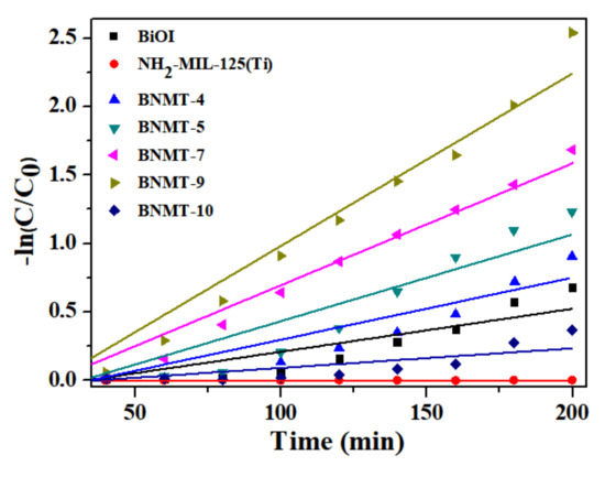 Colorless P-CP degradation experiments were carried out under visible light to avoid dye sensitization. From Figure 8c, no self-degradation of P-CP occurred within 160 min irradiation (blue triangle line). It can be clearly seen that the degradation percentage of the composites was 90% after the opening of the lamp 160 min, which was greater than BiOI. The UV–vis absorption total spectrometry of the BNMT-9 degradation of P-CP is shown in Figure 8d. The maximum absorption peak of P-CP was at 280 nm, and there is almost no concentration change within 40 min during the process of dark reaction. After turning on the lamp, the absorption peak decreased with the increase of time, and the peak became flat after 160 min. These results confirmed that the photocatalytic degradation performance of composite photocatalyst was excellent. Additionally, the reaction kinetics of RhB degradation can be further understood from the results of Figure 9. The rate constant of BNMT-9 was 0.0126 min−1, which was nearly 4.06 times that of pure BiOI (0.0031 min−1).