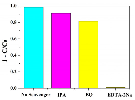 During photocatalytic reactions, the purpose of degradation and mineralization of pollutants was achieved by the transfer and transition of free radicals such as holes (h+), ·O2−, and ·OH. The addition of the corresponding radical scavengers in the trapping experiments of active species can prevent the photocatalytic reaction and judge the active species by the change of catalytic efficiency. To explore the main active species in the photocatalysis, a trapping experiment was carried out using BNMT-9 as catalyst under visible light. Ethylenediaminetetraacetic acid disodium salt (EDTA-2Na), p-benzoquinone (BQ), and iso-propyl alcohol (IPA) were introduced in degradation reaction solution separately to trap h+, ·O2−, and ·OH, accordingly [30,31]. As depicted in Figure 11, it can be observed that the degradation of RhB was hardly affected by IPA and BQ, whereas the photocatalytic decomposition of RhB declined significantly with the addition of EDTA-2Na. The results showed that ·OH, ·O2−, and h+ were all active species, among which h+ was the main active species, which played an important role in the BNMT-9 degradation of RhB.