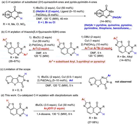 C–H arylation of fused-pyrimidinone derivatives. (a) C-H arylation of substituted (2H)-quinazolin4-ones and pyrido-pyrimidin-4-ones; (b) C-H arylation of thiazolo[5,4-f]quinazolin-9(8H)-ones; (c) Limitation of the scope; (d) This work: Cu-catalyzed C-H arylation with diaryliodonium salts.