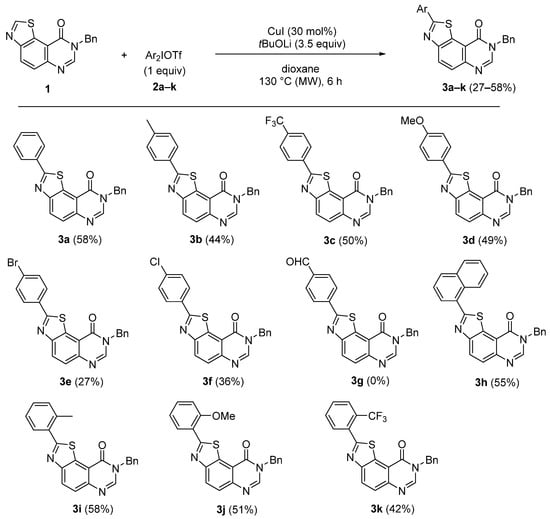Bi-heterocylic structures are found in many bioactive compounds and fused pyrimidinones represent a relevant substructure in medical chemistry, exhibiting a broad range of pharmacological activities. Although the synthesis of functionalized polyaromatic heterocycles is commonly realized through cyclization pathways including condensation and multicomponent reactions, the heterocycles derivatization from the preformed cycles is fairly appealing. For this reason, late-stage C–H arylation of heteroarenes appeared as a tailored tool for incorporating diversifications into high valuable scaffolds, notably in drug discovery [1,2,3]. It is now recognized that a slight modification of the core motif triggered by the incorporation of an aryl moiety or a functional group onto the skeleton could have a huge impact on the pharmacological profile compared to the parent compound. This expanding methodology’s main feature is the introduction of structural diversity into complex molecules having multiple Csp2–H bonds [4,5,6,7,8]. Our group has previously reported the selective palladium-catalyzed and copper assisted C2–H arylation of quinazolin-4-ones, pyrido-pyrimidin-4-ones (see (a) in Scheme 1a) and thiazolo[5,4-f]quinazolin-9(8H)-one under microwave irradiation (Scheme 1b) [9,10,11,12,13,14]. This aforementioned heterocycle was used as a versatile scaffold for Structure Activity Relationship (SAR) studies in DYRK1A kinase inhibition involved in the field of neurodegenerative diseases [15,16,17] and cancer therapy [18,19,20]. Nevertheless, the developed synergistic Pd/Cu catalysis suffers from some limitations, including the use of a large amount of transition-metal catalysts and poor reactivity of certain classes of substrates. For example, this strategy was proved to be inefficient in some fused-pyrimidinone series (Scheme 1c). We then hypothesized that a similar strategy could be used to synthesize various arylated polycyclic N-containing heteroarenes using an eco-friendlier C–H arylation reaction. Since diaryliodonium salts have gained extensive attention as smooth and selective electrophilic arylation reagents under both metal-catalyzed and metal-free conditions [21,22,23,24,25,26,27,28,29], we envisioned the use of this non-toxic and easy to handle class of hypervalent iodine compounds as coupling partner [30,31,32,33,34,35,36,37,38,39,40] (Scheme 1d). As part of our ongoing effort to develop direct C–H arylation procedures on heteroarenes, herein we report a copper-catalyzed complementary arylation of thiazoloquinazolinones and fused-quinazolinone analogues with diaryliodonium triflates.