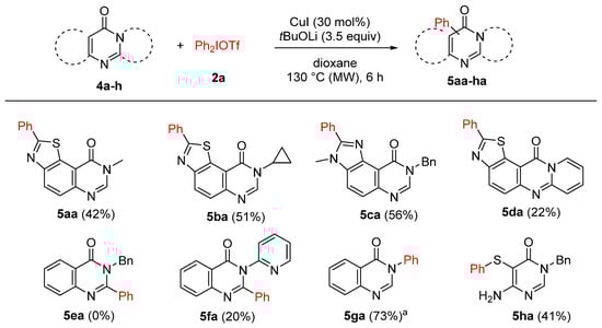 Scope of fused-pyrimidinone derivatives for the copper-catalyzed C–H phenylation. a 3 equiv of 2a was used.