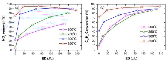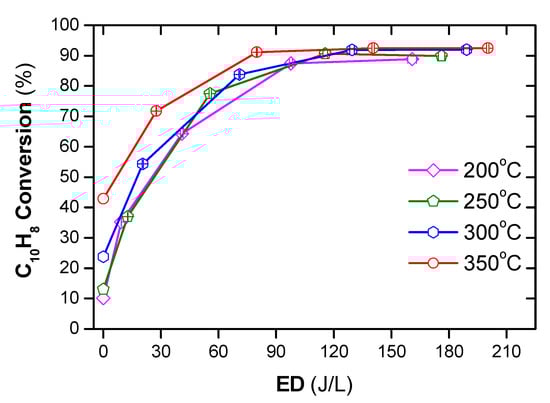 Conversion of naphthalene under temperature from 200 to 350 °C under various ED (energy density) (total flow rate of 2 L/min including: 48 ppm naphthalene, 300 ppm NO, 3.7% H2O, 10% O2, and N2 as balance). Reprinted from Ref. [2], 2019, MDPI.
