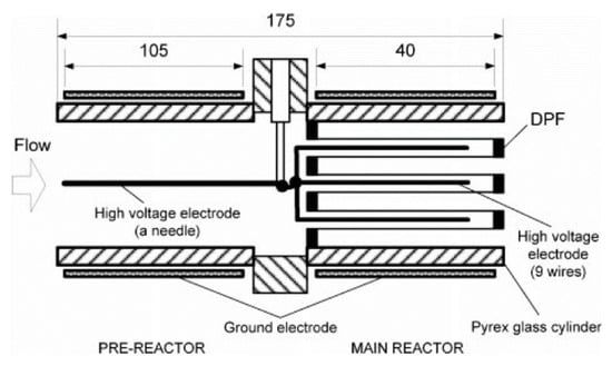 In another case with DPF, Tran et al. [60,85,86] created a DBD in a honeycomb structure, which consisted of the pre-reactor (coaxial DBD) conjugated with the main reactor (honeycomb discharge in a DPF), as shown in Figure 8. Specifically, the discharge zone of the pre-reactor was created by a steel needle of 1.8 mm diameter located at center Pyrex glass cylinder (ID: 36 mm; OD: 50 mm; length: 120 mm) as high voltage electrode, and stainless-steel foil (105 mm in length) wrapped the cylinder as ground electrode surrounding. The honeycomb discharge was carried out with a bunch of nine steel wires (0.6 mm in diameter) inside honeycomb cordierite holes (OD of honeycomb: 35.5 mm; square hole: 1.5 × 1.5 mm) acting as a high voltage electrode, while the second stainless steel foil, 40 mm in length, covered another cylinder as a ground electrode. The honeycomb played a PM filter as well as a dielectric layer along with the main cylinder. The plasma source has been used to treat DEG at low temperature (surrounding temperature without heating equipment); the presence of PM conjugated with the plasma has improved the NOx removal at low-temperature ranges [86].