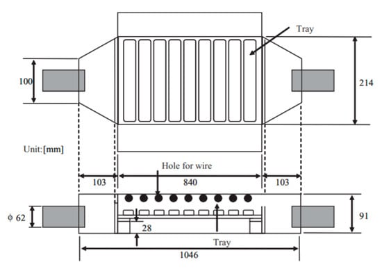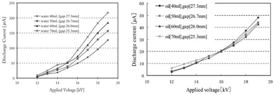 Yoshioka and co-workers developed a new method for PM removal from the exhaust gas of 2.4 kVA diesel engine [93]; this was corona discharge based on 9 trays of the conventional engine oil or treated water with a surfactant, to enhance the PM absorbent of water. The corona was generated by 9 copper wires (0.3 mm in diameter) along with 9 aluminum plates, and the distance between wire and plate were fixed at 30 mm, as shown in Figure 11. The discharge current of water trays was higher than that of oil trays; moreover, the discharge current increased toward the water depth, but it changed negligibly by the oil depth, as shown in Figure 12. The PM removal test indicated that more than 85% of PM in the exhaust gas from the diesel was absorbed by the system in both cases of oil or water trays. The PM has been absorbed in the water or oil which can be easily replaced by fresh water and oil; therefore, the PM removal system can be operated with a long time.