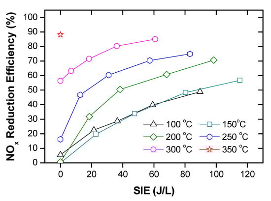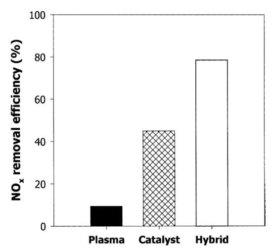 A DBD plasma discharge coupled with Ag/α-Al2O3 catalyst was employed for the simultaneous removal of NOx and soot simulant (naphthalene) in Figure 9 [2]. In which, the simulated DEG consisted of 300 ppm NO, 265 ppm n-heptane, 48 ppm naphthalene, 10% O2, 3.7% H2O, and N2 balance. The simultaneous removal of PM and NOx was carried out under the range of operating temperatures from 200 to 350 °C, along with ED from 0 to 210 J/L. The results showed that, under the presence of plasma, removal of PM and NOx occurred at low temperatures. Interestingly, the simulated PM played as a reducing agent for NOx reduction under assisted plasma at low temperature; however, the NOx removal was lower, 10–20%, with the absence of n-Heptane, simulated HC, in the DEG. The high-efficiency soot simulant, as well as NOx and HC, removal of 90% at a temperature of 350 °C and the ED at least 90 J/L; the EE for NOx and soot simulant removal was 6.18 g(N)/kWh and 8.48 g/kWh for C in naphthalene, respectively.