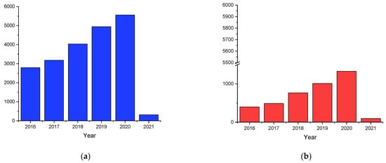 Results of a search in the Scopus database limited to the period 2016–2021: (a) search string “Catalyst AND Design”; (b) Search string “Catalyst AND Design AND Strategy.” Last access to the database on 22 December 2020.