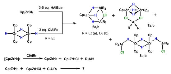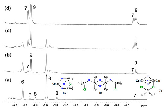Our investigation of the reaction of Cp2ZrCl2 with HAlBui2 at low content of organoaluminum compound (OAC) and [Zr]:[Al] = 1:(3–5) showed the existence of a Zr,Zr-hydride intermediate 7 [47], along with the well-known Zr,Al-hydride clusters 6 [41,44,50] and 8 [41,42] (Figure 1a, Scheme 4, Table 2). As we have previously demonstrated [46], an equilibrium mixture of complexes 6–8 is also formed upon the interaction of [Cp2ZrH2]2 with ClAlEt2 taken in 1: 3 ratio. In this case, a larger relative amount of complex 7 is observed (Figure 2a). This complex, in fact, is the product of replacing one hydride atom in the zirconocene dihydride dimer with chlorine. Therefore, it can be considered as a complex formed in the reaction of the Cp2ZrH2 monomer with Cp2ZrHCl. The dialkylaluminum hydride, produced as a result of the chloride/hydride exchange, reacts with Cp2ZrH2 and ClAlEt2, providing trihydride complex 6.