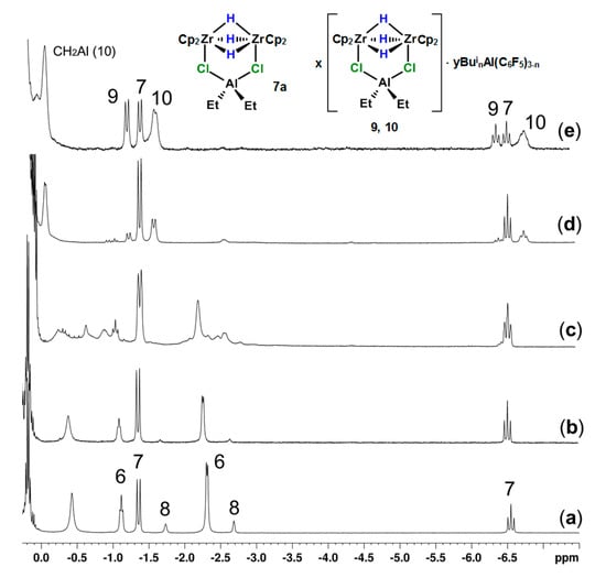 1H NMR of the [Cp2ZrH2]2-ClAlEt2-(Ph3C)[B(C6F5)4] system in C6D6 (T= 299 K): (a) [Zr]:[Al]:[B] = 1:4:0; (b) [Zr]:[Al]:[B] = 1:4:0.15; (c) [Zr]:[Al]:[B] = 1:4:0.2, upper layer; (d) [Zr]:[Al]:[B] = 1:4:0.2, heavy fraction; and (e) [Zr]:[Al]:[B] = 1:3:0.5. The order of mixing the reagents is (Ph3C)[B(C6F5)4]–ClAlEt2–[Cp2ZrH2]2.