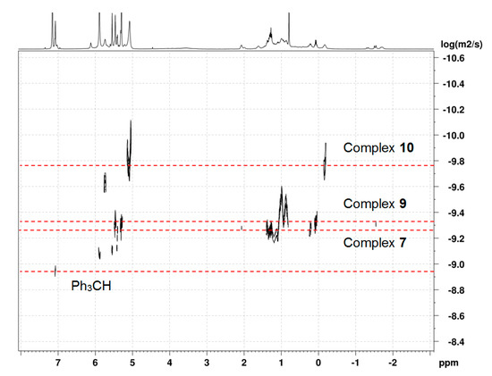 An estimation of the hydrodynamic radii and volumes of complexes 6–10 through the diffusion coefficients determined using the diffusion ordered spectroscopy (DOSY) is shown in Table 2. The hydrodynamic radii Rh were calculated using the modified Stokes–Einstein equation, Equation (1) [55,56], as follows: