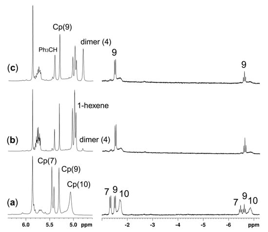 NMR monitoring of the reaction of complexes 7, 9, and 10 with 1-hexene in d6-benzene (intensity of upfield signals is increased): (a) [Cp2ZrH2]2-ClAlEt2-(Ph3C)[B(PhF5)4] system, [Zr]:[Al]:[B] = 1:3:0.5; (b) [Zr]:[Al]:[B]:[1-alkene] = 1:3:0.5:3.5, 5 min; and (c) [Zr]:[Al]:[B]:[1-alkene] = 1:3:0.5:3.5, 10 min.