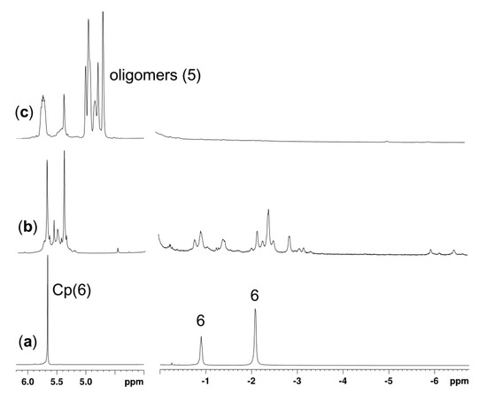 The trihydride complex 6, mainly formed both in system A and in system B with an excess of OAC, reacts with (Ph3C)[B(C6F5)4] to give a mixture of intermediates, which give rise to signals in the −6.6 to −0.1 ppm range for hydride atoms (Figure 1a–c, Figure 2c and Figure 5b) and which are in intermolecular exchange, as follows from the EXSY spectra (Figure S22, Supplementary Materials). The composition of the mixture depends on the [Zr]:[Al]:[B] ratio and the order of reagent mixing. The observed 1H NMR signal splitting is probably caused by the hydrogen atom removal with the formation of Ph3CH and cationic complexes structurally similar to those described previously [11,26,27,39]. The addition of 1-hexene to this system leads to the appearance of oligomers as soon as in the 5th minute of the reaction (Figure 5c, Scheme 6).