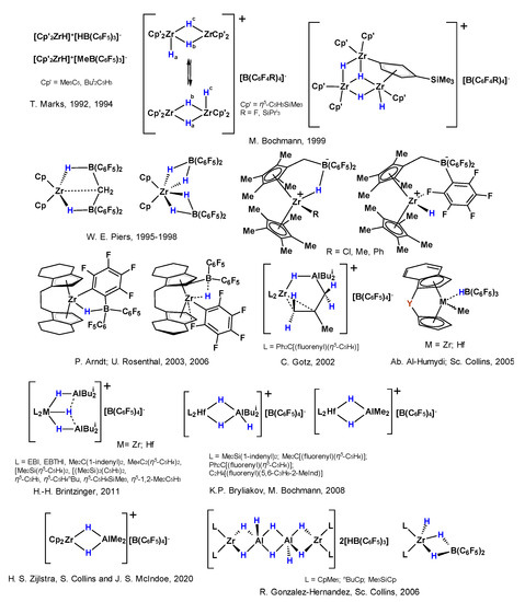 - Baldwin, S.M.; Bercaw, J.E.; Brintzinger, H.H. Cationic Alkylaluminum-Complexed Zirconocene Hydrides as Participants in Olefin Polymerization Catalysis. J. Am. Chem. Soc. 2010, 132, 13969–13971. [Google Scholar] [CrossRef]