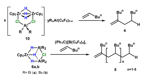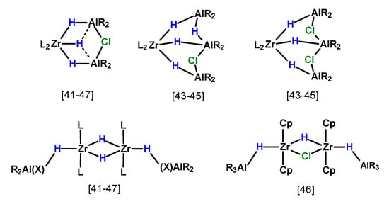 Our recent study was concerned with the structure, dynamics, and reactivity of hydride complexes generated in the following systems: L2ZrCl2-XAlBui2 (X = H, Cl, Bui) [41,42,43,44,45] and [Cp2ZrH2]2-ClAlR2 (R = Et, Bui)-methylaluminoxane (MMAO-12) [46,47] (Scheme 2). Among the hydride complexes, novel Zr,Zr-structures were identified and their high affinity to MAO with the ability to give x[Cp2ZrH2∙Cp2ZrHCl∙ClAlR2]∙yMAO-type adducts was shown [46]. Moreover, the adducts were found to be reactive towards alkenes to specifically give dimerization products in high yields [47].