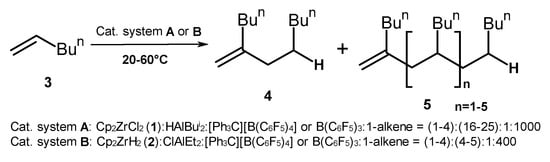 The L2ZrCl2-XAlBui2 (X = H, Bui) and [Cp2ZrH2]2-ClAlR2 bimetallic systems perform alkene hydrometalation providing zirconium and aluminum alkyls [48,49]. The addition of (Ph3C)[B(C6F5)4] or B(C6F5)3 to the Cp2ZrCl2 -XAlBui2 system (X = H, Bui) (X = H, Bui) (catalytic system A) gives alkene dimers (4) and oligomers (5) (Scheme 3, Table 1). The product yield and chemoselectivity markedly depend on the reagent ratio and reaction temperature. For example, the reaction carried out at [Zr]:[Al]:[B]:[1-alkene] ratio of 1:16:1:1000 and a temperature of 40 °C for 90 min results in 60% conversion of 1-hexene (Table 1, Entry 1). In the mixture of oligomeric products, dimer 4 predominates (41% yield). The increase of the reaction temperature to 60 °C leads to higher monomer conversion (at the level of 95%) and maximizes the percentage of oligomeric products (Table 1, Entry 2).