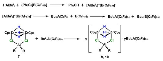 We assume that 7 interacts with perfluorophenylaluminum (Scheme 5), which may be generated via the reaction of (Ph3C)[B(C6F5)4] with dialkylaluminum hydride, formed in the [Cp2ZrH2]2-ClAlEt2 system (Scheme 4). Indeed, NMR monitoring of the reaction of HAlBui2 with (Ph3C)[B(C6F5)4] showed the appearance of Ph3CH (δH 5.40 ppm), BuinAl(C6F5)3−n and BuinB(C6F5)3−n within 5 min (Figures S5 and S6, Supplementary Materials). The latter (BuinAl(C6F5)3−n and BuimB(C6F5)3−m) are generated as a result of [AlBui2]+[B(C6F5)4]− degradation (Scheme 5) [53,54]. The coordination of complex 7 with the organoaluminum compound BuinAl(C6F5)3−n, which gives adducts 9 and 10, follows from the cross-correlation of doublet signal of the hydride atom at −1.51 ppm with the signal of o-F atoms of the perfluorophenyl group in OAC at −120.78 ppm in the 1H-19F HMBC spectra (Figure S8, Supplementary Materials).