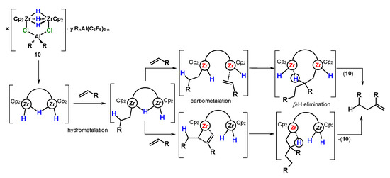 - Parfenova, L.V.; Pechatkina, S.V.; Khalilov, L.M.; Dzhemilev, U.M. Mechanism of Cp2ZrCl2-catalyzed Olefin Hydroalumination by Alkylalanes. Russ. Chem. Bull. 2005, 54, 316–327. [Google Scholar] [CrossRef]