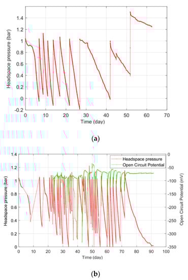 The electrodes were installed into the same glass reactor used in Phase 1 (Figure 6), and the Phase 1 procedure with fresh inoculum was repeated until it reached the stable headspace pressure. During this phase, the electrodes were not poised with voltage, and the experiments were performed in OCM. During this phase, it took 90 days to for the gas consumption or saturated gas consumption to cease.