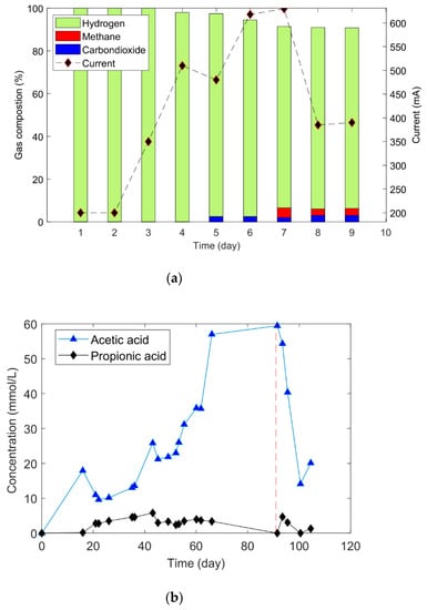 Phase 3 was prolonged for 10 more days. Figure 3a shows the gas-composition variation and the generated current. At the beginning of Phase 3, H2 was the only gas product (100%). After five days of operation, a trace amount (3%) of CO2 started to evolve, followed by methane (CH4) evolution (6%) on day 7. The H2 gas occupied more than 90% of the headspace. It is difficult to conclude whether the produced hydrogen had an abiotic or biotic origin; this will require several more experiments at different potentials to establish the shares of hydrogen production. However, the decrease in acetic acid concentration (Figure 3b) in CCM partially confirmed that hydrogen could be produced abiotically at the cathode. The decline in acetic acid concentration implied that acetic acid could be the source of the protons and electrons for the produced gases.