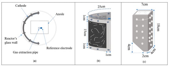 An upper cross-section of the reactor with electrode arrangements and electrode design with dimensions. (a) The upper cross-section, (b) the cathode, and (c) the anode.