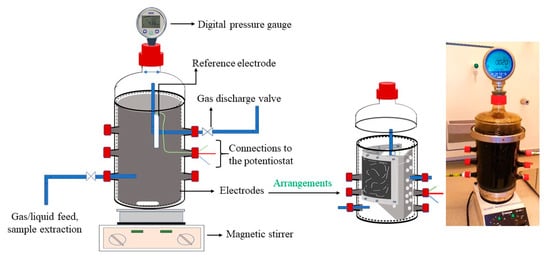 Once the saturated gas-consumption level was reached in Phase 2, it was prolonged in CCM. During CCM, the cathode was poised with −0.8 V vs. SHE by using a Gamry 1010B Potentiostat-Galvanostat-ZRA (Gamry Instruments, Philadelphia, PA, USA). This particular potential value was selected in accordance with similar studies performed by Nelabhotla et al. [16], during which they observed significant acetic acid production within the potential range of −0.8 to −0.9 V vs. SHE in a single-cell MES reactor.