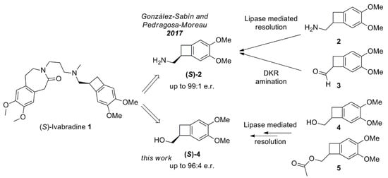 Overview on ivabradine 1 and the possible biocatalytic routes [] to the synthesis of its precursors (S)-2 and (S)-4.