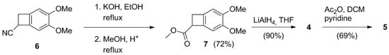 A mixture of the 3,4-dimethoxybicyclo[4.2.0]octa-1,3,5-triene-7-carboxylic acid obtained (1.84 g, 8.9 mmol) and methanol (20 mL) was stirred for 15 min. Then, a few drops of concentrated H2SO4 were added and the mixture was refluxed for 8 h. The resulting mixture was cooled down at room temperature and the solvent was evaporated under reduced pressure; the residue was washed with NaHCO3 (aq.) and extracted three times with ethyl acetate (3 × 50 mL). The combined extracts were dried over anhydrous Na2SO4, filtered, and then concentrated in vacuum to yield the brown oil. Purification of the crude oil on a column chromatography silica gel (eluent hexane/ethyl acetate from 9:1 to 7:3) afforded 7 (1.65 g, 85%). 1H-NMR (400 MHz, CDCl3) δ 6.77 (s, 1H, Ar H), 6.71 (s, 1H, Ar H), 4.22 (dd, J = 3.9 Hz, 1H, -CH-), 3.85 (bs, 6H, -OCH3), 3.74 (s, 3H, -COOCH3), 3.39 (d, J = 3.9 Hz, 2H, -CH2-). 13C-NMR (101 MHz, CDCl3) δ 173.1 (C=O), 150.6 (Ar), 149.9 (Ar), 135.7 (Ar), 133.7 (Ar), 107.6 (Ar), 106.9 (Ar), 56.4 (-OCH3), 56.3 (-OCH3), 52.0 (-COOCH3), 44.8 (-CH-), 33.4 (-CH2-). (See Figure S1 in the Supplementary Materials for NMR spectra.)