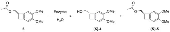 A mixture of (3,4-dimethoxybicyclo[4.2.0]octa-1,3,5-trien-7-yl)methanol 4 (50 mg, 0.26 mmol) in tert-butyl methyl ether (TBME, 5 mL) and vinyl acetate (10 eq) was stirred for 10 min at room temperature. Then, enzyme (300 U) was added and the resulting mixture was stirred from 1 to 48 h. To check the flow of the acetylation reaction, 200 µL withdrawals were performed every 30 min or 1 h, according to the type of enzyme. Once withdrawn, the reaction medium was filtrated, diluted with 800 µL of TBME, and analyzed by GC-MS to determine the conversion. The same samples were injected into chiral HPLC to evaluate the enantiomeric excesses of the products. (See Figures S9–S12 in the Supplementary Materials for HPLC chromatograms and Figures S13 and S14 for the selectivity profiles of the kinetic resolution of the racemate.)
