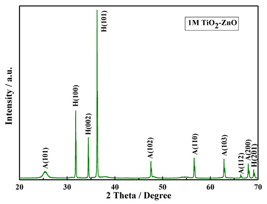 XRD result 1 M of TiO2-ZnO nanocomposite [A: Anatase, and H: Hexagonal].