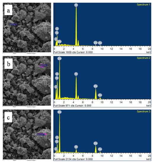 EDS results of TiO2-ZnO nanocomposites: (a) Spectrum 1 (b) Spectrum 2 (c) Spectrum 3.