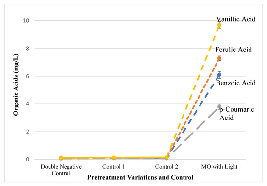 Vanillic acid (9.71 ± 0.23 mg/L), ferrulic acid (7.34 ± 0.16 mg/L), benzoic acid (6.12 ± 0.17 mg/L) and p-coumaric acid (3.80 ± 0.13 mg/L) were determined as the main lignin derivatives as a result of the POC process (Figure 5). These products correspond to 88% of the lignin oxidation products that were detectable, while previously reported amounts were significantly less compared to our 88% using the UV/TiO2 system [11]. The VFA analysis and pH was categorized to study the variation caused by pretreatments which showed the pH was constant. There are some variations which may be due to the open system and volatile products. The PCO process was carried out using one double negative control having lignin and water only (Control 1), another with lignin in water with TiO2-ZnO but no exposure to light (Control 2) and finally lignin in water without TiO2-ZnO and exposed to light. All the results presented were taken from triplicate analyses and the deviations are also within the experimental range.