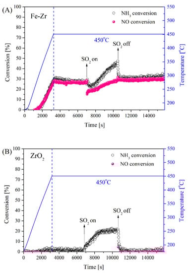 2.2.3. SO2 Activation of Cu-Zr and Fe-Zr Catalysts and their Catalytic Behavior in NH3-SCR of NO in the Absence and Presence of Water Vapor