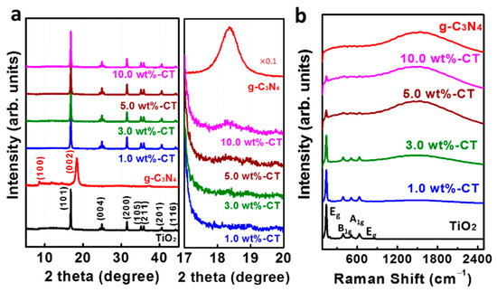 (a) Synchrotron X-ray spectra and (b) Raman spectra of the various g-C3N4/TiO2 catalysts.