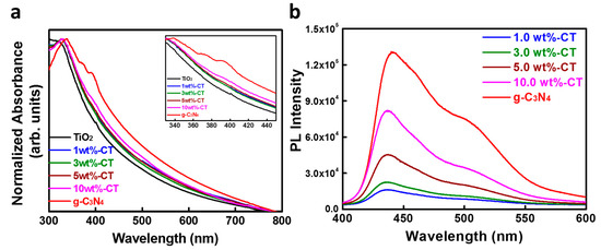 Optical properties of various g-C3N4/TiO2 catalysts; (a) absorbance spectra; and (b) PL spectra.