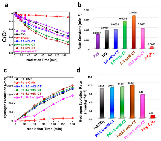 As mentioned above, the successful incorporation with the visible-driven g-C3N4 NS significantly improved several crucial factors for photocatalytic reaction, such as optical absorption, surface area, and heterojunction construction. To comprehend the optimal incorporation of g-C3N4 NS for the catalytic activities, we evaluated their photodegradation of organic dyes and photocatalytic hydrogen production. In the photodegradation of methyl orange (MO), the essential elements are rich reactive oxygen species (ROS), which are highly active in attacking the organic dye, leading to discoloration. The 2D/1D heterostructure of g-C3N4/TiO2 catalyst provides an alternative approach for the charge carrier migration, inhibiting the recombination and promoting the photo-excited electron-hole pairs to produce ROS efficiently. Figure 6a presented the photodegradation activity using various g-C3N4/TiO2 catalysts. Bulk g-C3N4 showed lower activity compared to TiO2 NF, which was attributed to low crystalline and structural defects in bulk g-C3N4. Notably, incorporating the visible-driven g-C3N4 NS with TiO2 NF enhanced the overall degradation activity, and its reaction rate constant was up to 0.0099 min−1 as the amount added to 5.0 wt%. Up to 10.0 wt%, discoloration behavior was inhibited (Figure 6b). It indicates that much more g-C3N4 might dominate the surface feature because of the significant enhancement of SBET and optical absorption, whereas influenced exposure of TiO2 active sites, leading to low intrinsic activity. Likewise, under the Xe lamp irradiation, the photocatalytic hydrogen production presented the tendency as the g-C3N4 amounts increased to 5.0 wt%, in which the hydrogen production rate was 11.62 mmol·h−1·g−1 (Figure 6c,d). Here, Pd NP decorated by the wet-impregnation method assisted the electron collection on the surface for proton reduction to hydrogen. Based on our best knowledge, excellent ordering in highly crystalline TiO2 NF retains the numbers of electron-hole pairs and avoids the recombination as irradiated. When Pd NP locates at the interface of a metal oxide such as TiO2, the Schottky barrier forms and facilitates electron rectification, not back to metal oxide as electron once passes through the interface [6]. Thus, the optimal 5.0 wt% g-C3N4/TiO2 catalyst with sufficient active sites and efficient charge transfer revealed significant photocatalytic activities.
