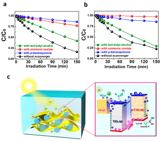 The photodegradation curves of (a) TiO2 NF and (b) 5.0 wt% g-C3N4/TiO2 catalyst toward the methyl orange with various scavengers, and (c) the scheme of the charge transfer mechanism.