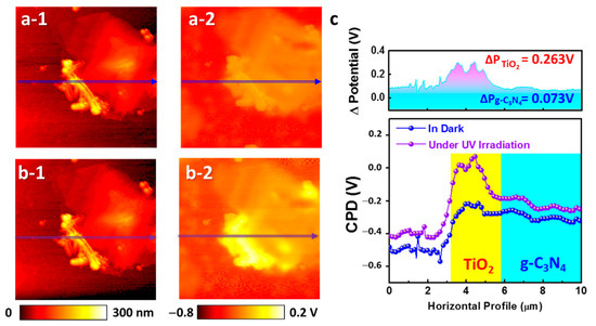 To clarify the charge transfer in the heterostructure of g-C3N4/TiO2, we measured the surface potential and calculated the contact potential difference (CPD) with/without UV irradiation (Figure 9). The surface topographic images for TiO2 NF and g-C3N4 NS clearly observe the TiO2 NF laid on g-C3N4 NS in Figure 9a-1. We further conducted the surface potential mapping in this area. In dark (Figure 9a-2), both TiO2 NF and g-C3N4 NS presented similar CPD due to the successful construction of heterostructure, causing the fermi level alignment. As UV irradiated to the g-C3N4/TiO2 (Figure 9b-1), the surface potential of TiO2 increased significantly instead of that of g-C3N4 (Figure 9b-2). The slight increment of surface potential on g-C3N4 (0.073 mV) suggested an overall fermi level increase, indicating a positive work function shift (Figure 9c). It also indicated that the photo-induced electrons might migrate to TiO2, whose average potential change (∆P) is about 0.263 V. A dramatic increment in potential which is observed in the interface between TiO2 NF and g-C3N4 NS implied electrons transfer. This result elucidated the g-C3N4/TiO2 constructed with the type II heterojunction. The photo-assisted KPFM would help verify the heterojunctions and the charge migration in the multidimensional photocatalyst.