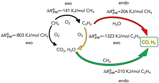 Moreover, in some notable cases, such as reforming reactions utilized for production of syngas (or combined production of syngas and ethylene, as illustrated in Figure 1), concurrent endo- and exothermic processes are coupled to achieve autothermic conditions, in which the exothermic reaction provides the heat for the endothermic one [17,18].