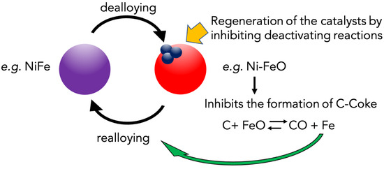 As discussed in the previous paragraph, CO2 can react with methane in a dry reforming process to produce syngas, a mixture of hydrogen and carbon monoxide with a molar ratio around 1:1 (reaction 1). Among the variety of metals that have been screened to catalyze this reaction, Ni is one of the most investigated because of its low cost and high activity. In particular, Ni alloys have been extensively studied in view of their superior stability under operational conditions. Müller and co-workers demonstrated that NiFe alloys are able to generate a dynamic dealloying/re-alloying loop in response to changes of microenvironmental conditions during dry reforming, which prevents the formation of carbon coke, improving the overall efficiency of the catalyst [42]. The result is an adaptive catalyst, which is able to maintain its activity by dynamically modifying its phase (Figure 3).