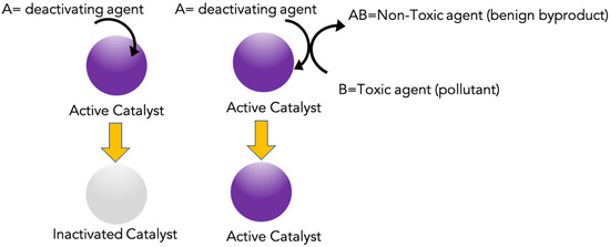 Scheme representing the use of toxic or unwanted reagents/byproducts to prevent catalyst’s deactivation. See [43] for details.