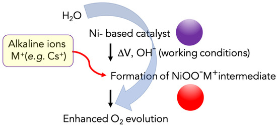 Thus, the catalysis of OER can strongly benefit from systemic approaches. In a recent paper, the Koper’s group demonstrated that alkali cations can be a powerful factor for enhancing OER catalysed by Ni-based electrodes [49], as illustrated in Figure 7.