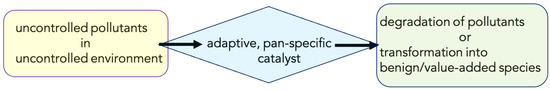 Environmental remediation is another sector of catalysis in which a systemic approach can allow to achieve major breakthroughs. Although most of the literature is focused on the catalytic degradation of specific targets, real systems are characterized by the simultaneous presence of many chemical species with extremely variable concentrations. Moreover, the concentration of these chemical species can vary not only from one system to another, but also in the same system as a function of time under the mutual influence of different environmental factors (pH, partial pressure, temperature, mass transport, etc.). This is the case, for example, of pollutants dispersed in water (rivers, sea, lakes, aquifers, ground-, waste-, and tap water), whose nature and relative concentration is typically unpredictable a priori and largely influenced by the above-mentioned factors. Analogous, or even greater, complexity is characteristic of atmospheric pollutants and, in general, atmospheric chemistry, where meteorological factors play a key role in determining the oscillations of relative concentration of gaseous species. In view of finding a practical application in such complex and challenging environments, a catalyst should be able to cope with a variety of pollutants, interfering species and dynamic modifications of the external factors (Figure 9).