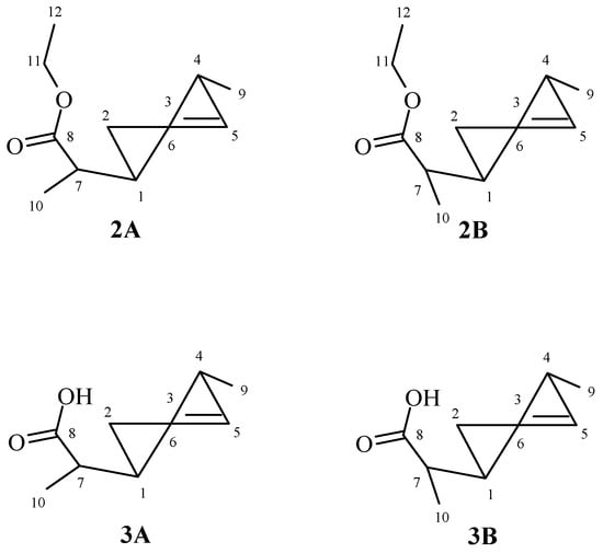 Basic hydrolysis of the obtained mixture of two diastereoisomers A and B of ester 2 was carried out according to the procedure described previously [27]. Briefly, 3.1 g of ester 2 was heated with 5% potassium hydroxide solution in methanol for 4 h. After evaporation of methanol, the residue was dissolved in water and acidified with 1 molar hydrochloric acid, and the product was extracted with diethyl ether. Then, 1.9 g (yield 72%) of acid 3 also as two diastereoisomers A and B was obtained. The spectral data of acid are as follows: 1H NMR (400 MHz, CDCl3): 0.94 (d, J=10.2 Hz, 3H, CH3-9B), 0.96 (d, J = 9.6 Hz, 3H, CH3-9A), 1.11 (d, J = 10.2 Hz, 3H, CH3-10A), 1.15 (d, J = 10.2 Hz, 3H, CH3-10B), 1.54–1.61 (m, 2H, H-4A, H-4B), 1.64–1.71 (m, 4H, CH2-6A, CH2-6B), 1.99–2.09 (m, 2H, H-1A, H-1B), 2.35–2.48 (m, 2H, H-7A, H-7B), 2.53–2.63 (m, 2H, H-5A, H-5B), 5.44–5.47 (dm, J = 0.0 Hz, 1H, H-2A), 5.55–5.58 (dm, J = 10.4 z, 1H, H-2B), 5.70–5.77 (m, 2H, H-3A, H-3B),13C NMR (100 MHz, CDCl3): 12.74 (C-10A), 13.18 (C-10B), 22.43 (C-9), 22.45 (C-9A), 28.95 (C-6A), 29.11 (C-6B), 34.00 (C-1B), 34.04 (C-1A), 36.05 (C-4A), 34.06 (C-4B), 39.22 (C-5A), 39.43 (C-5B), 43.77 (C-7A), 43.95 (C-7B), 127.56 (C-3B), 128.58 (C-3A), 128.90 (C-2B), 129.11 (C-2A), 181.31 (C-8B), 181.31 (C-8A), ESIHRMS: calcd for C10H16O2, m/z 169.1228 (M + H)+, found 169.1235. (Supplementary Materials, Figures S6–S10).