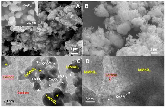 SEM image of LaMnO3 (A) and LaMnO3@C-Co3O4 composite (B); Inset (A) shows the SEM image of Co3O4 nano/microspheres; (C,D) TEM images of LaMnO3@C-Co3O4 composite catalyst.