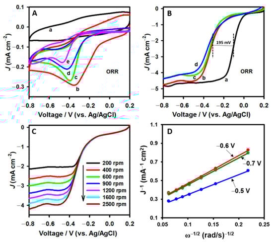 (A) CV curves of ORR activity at LaMnO3@C-Co3O4 catalyst electrode (a) in N2-saturated and LaMnO3@C-Co3O4 (b), LaMnO3@C-RuO2 (c), LaMnO3@C (d) and LaMnO3 (e) in O2-saturated 0.1 M KOH electrolyte at a scan rate of 50 mV Scheme 1. (B) LSV polarization curves for ORR activity at Pt/C (a), LaMnO3@C-Co3O4 (b), LaMnO3@C-RuO2 (c), LaMnO3@C (d) in O2-saturated 0.1 M KOH electrolyte at a scan rate of 20 mV s−1 with rotation speed of 1600 rpm. (C) RDE measurements of LaMnO3@C-Co3O4 catalyst electrode at different rotation speeds of 200–2500 rpm. (D) Koutecky-Levich relation between j−1 and ω−1/2 at LaMnO3@C-Co3O4 electrode at different potentials.