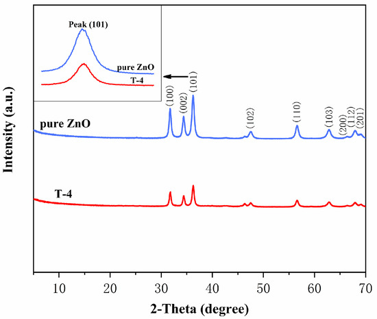 Figure 1. XRD patterns of pure ZnO nanoparticles and T-4 sample.
