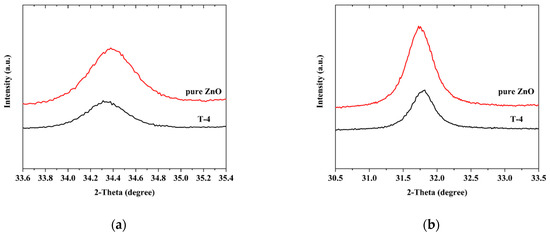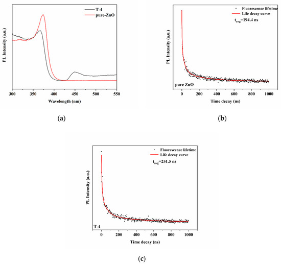 The existence of average lifetime was also found in the decay profile at 375 nm in Figure 5b,c [40]. The carrier average lifetime of ZnO was changed from 194.4 to 251.5 ns, suggesting that the photogenerated electron–hole recombination rate slowed down, which also proved the above conclusion.