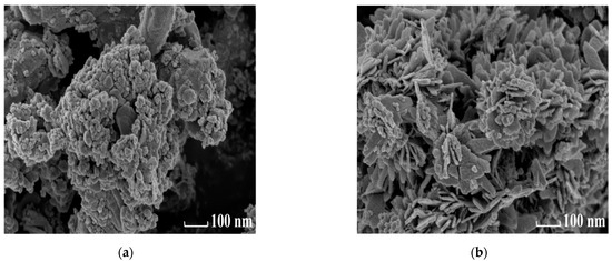 SEM images of original ZnO and T-4 samples are shown in Figure 3a,b, respectively. As shown in Figure 3b, the pure ZnO shows a spherical agglomerated structure with a diameter of 100–800 nm. After 120 min of modification process, the etching and bombardment effects were found on the surface of ZnO as well as a decrease in the degree of agglomeration, accompanied by smoother surfaces and smaller roughness, as shown in Figure 4a. In theory, the improvement of dispersibility and the reduction in nanoparticle size can effectively increase the specific surface area of ZnO, thereby increasing the number of reactive sites and improving photocatalytic efficiency. The specific verification can be observed from the BET test below.