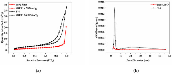 Figure 4 shows the changes in specific surface area and pore size distribution before and after plasma modification of ZnO. As shown in Figure 4a, the specific surface area of ZnO increased to 20.5630 m2/g after 120 min of plasma treatment, which is 4.3 times higher than that of pure ZnO. This may be due to the high energy of the plasma particles that etch the ZnO surface. The increase in the specific surface area can provide more reaction active sites for the photocatalytic reaction and improve the degradation efficiency. Figure 4b shows the pore size distribution curve of the sample. It can be seen that the small pores of pure ZnO and T-4 are all distributed around 3 nm, and the large pores of T-4 are all distributed between 15 and 30 nm. This porous structure is possibly caused by the gaps between small nanoparticles.