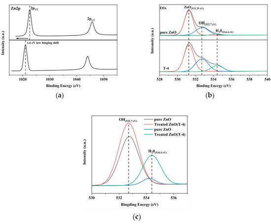 X-ray electron spectroscopy (XPS) was used to evaluate the difference before and after Ar–H plasma surface treatment. Figure 6a shows the XPS spectra for Zn 2p core level peaks; the Zn 2p core energy peak shifted from 1022.6 eV to the binding energy region of 1021 eV. The results display that the Zn on the surface of ZnO changes from oxygen-rich zinc before treatment to ZnO containing metallic zinc after treatment. O 1s spectra is shown in Figure 6b; it can be seen that the main O 1s peaks of ZnO nanoparticles are fitted to the three peaks of 531.25, 532.7, and 534.4 eV, corresponding to Zn-O, the physically absorbed OH radicals and molecular water on the surface of ZnO, respectively [41]. The shoulder peaks matching the OH radicals and molecular water increase significantly after plasma treatment and the peak intensity increased significantly, indicating that the chemical adsorption and physical adsorption of OH radicals and molecular water on the surface of ZnO are enhanced. Figure 6c shows the specific changes in the intensity of OH radicals and molecular water peaks before and after plasma treatment. The results show that Ar–H plasma treatment not only increases the concentration of OH radicals but also has an effect on the surface adsorption of molecular water in the air, which can cleave the double bond (C=N) to decompose the Rh B solution and couple with the N-H single bond of the Rh B solution, improving effectively the photocatalytic effect ultimately.